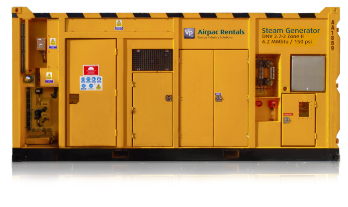 Airpac Rentals’s 6.2 MMbtu Zone II Steam Generators are installed in purpose built DNV 2.7-1 containers (fully compliant to DNV 2.7-2).