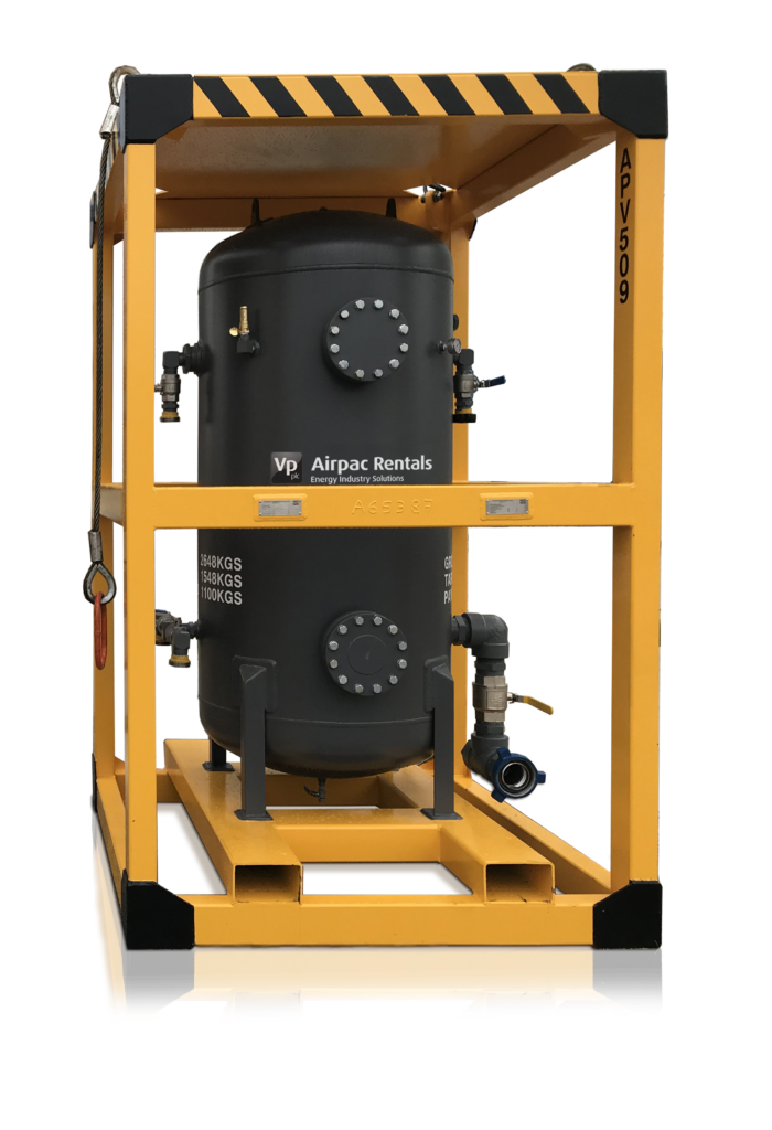 Airpac Rentals provide a range of small footprint vertical air receivers capable of storing from 14ft³ (396 litres) to 80ft³ (2265 litres) of compressed air. Pressures range from 10.3 bar (150 psi) to 38.5 bar (558 psi).